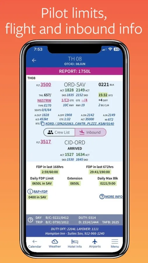 US Part 117 calculations and Canadian flight/duty limits! Easily monitor your legality with cumulative lookbacks. Monitor your Daily FDP duty-off and Block limits, too!