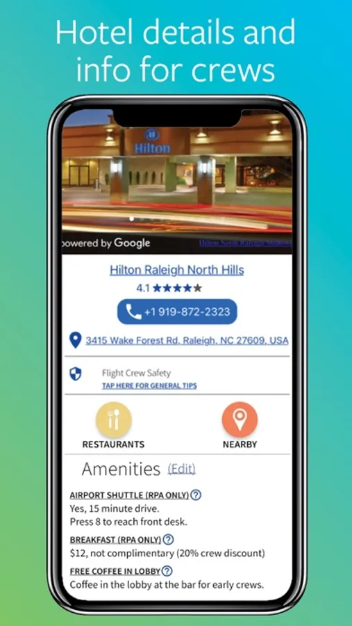Hotel info: hotel amenities and local restaurants, bars, and attractions that are constantly updated by crews.