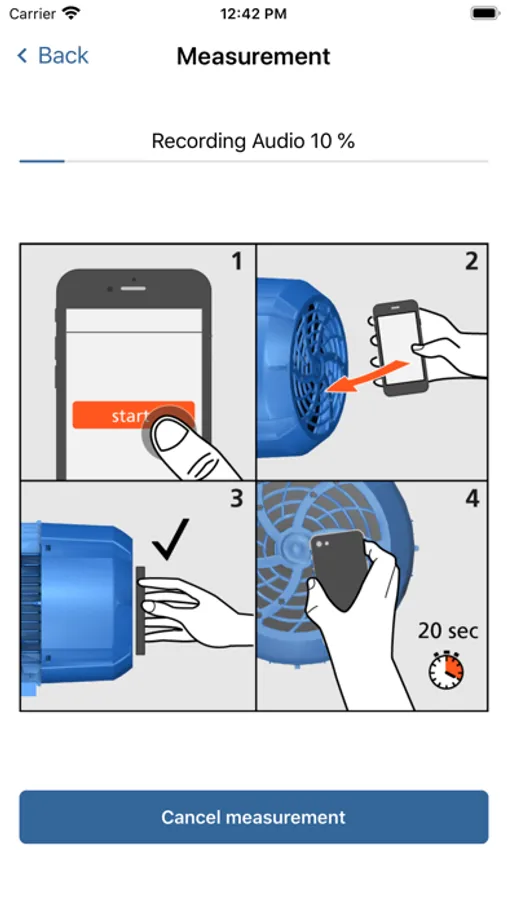 You enter four parameters which you can find on the type plate of the machine and hold your mobile device for 20 seconds close to the fan of the induction motor operated with constant supply voltage and frequency. Sonolyzer captures the operational noise with the inbuilt microphone and analyses the noise spectrum within seconds.