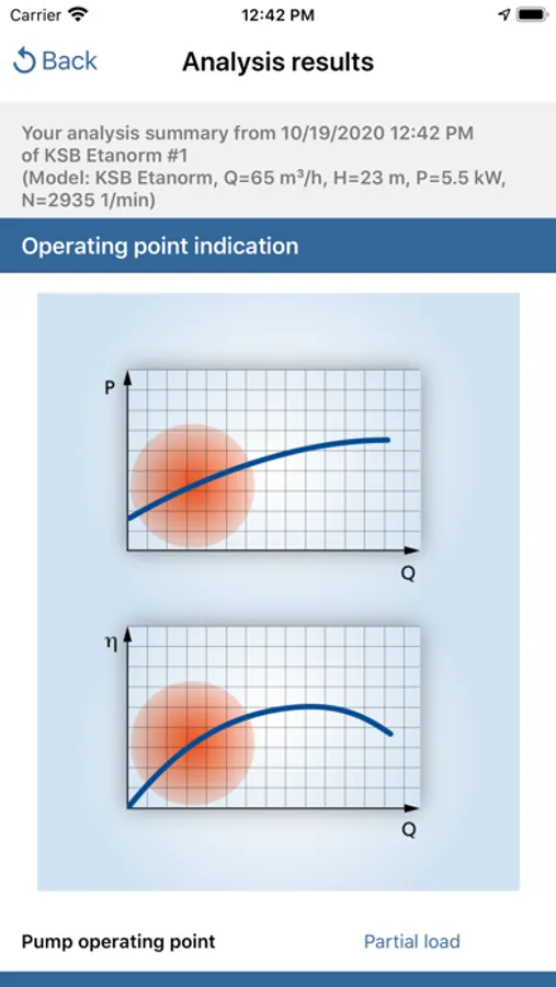 The results are displayed afterwards on your device display, e.g. that pump and motor are operated in partial load. You can request advice based on your individual analysis, and your locally responsible KSB contact can connect seamlessly to your analysis.
