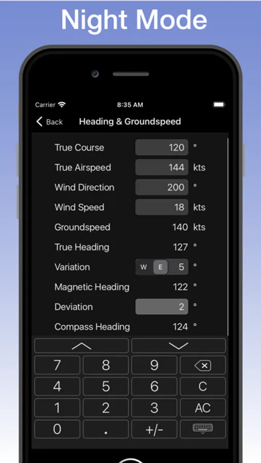 An E6B flight computer is traditionally an analog device resembling a combination slide rule and slide wheel that performs calculations specific to aviation. For example, an E6B can be used to calculate heading and groundspeed after taking into account forecast winds. An E6B is also used to calculate data used for performance planning such as density altitude. Our version goes beyond the analog E6B and even beyond all other E6B apps by including functionality to calculate time, rate and radius of turns, pivotal altitude (great for flight training use), and more.
