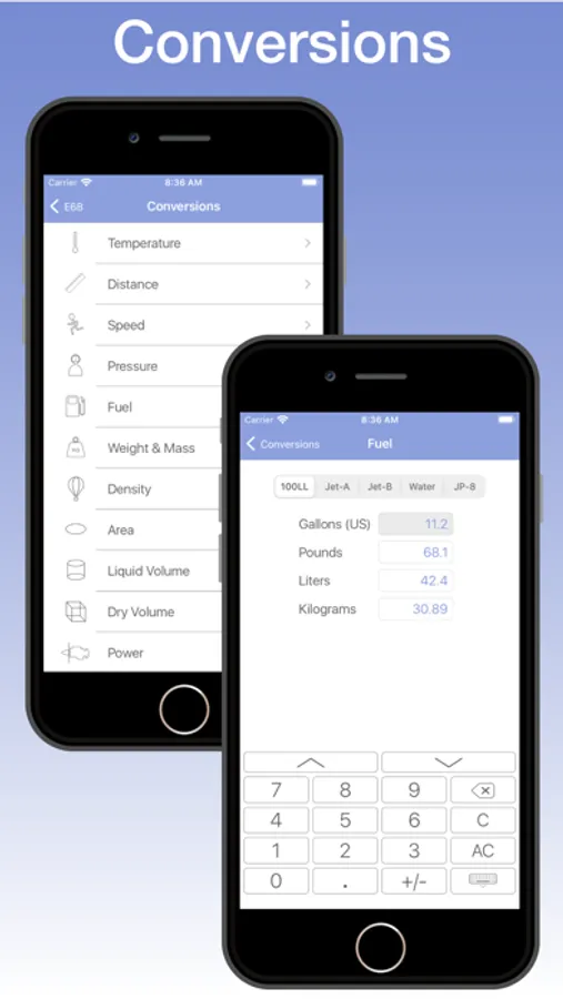 ▸ Convert between mass (pounds and kilograms) and volume (gallons and liters) for 100LL, Jet A, Jet B, and Water