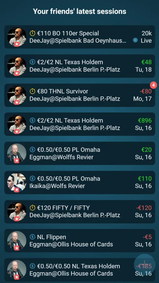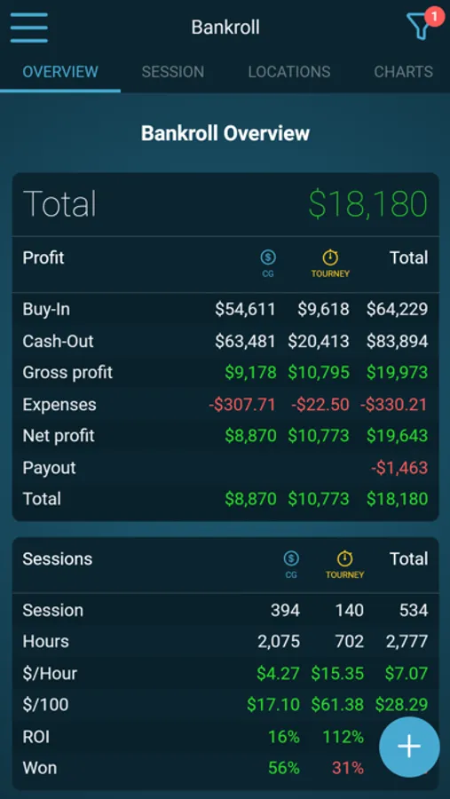 Track your poker sessions and share them with your friends! With Poker Bankroll Tracker you can save your poker sessions to have an overview of your bankroll. With many filter options you can find leaks in your game and see a lot of statistics. You can also connect with your friends and watch their sessions live! The Poker Bankroll Tracker also provides useful tools like an odds calculator, deal calculator or a payout calculator.