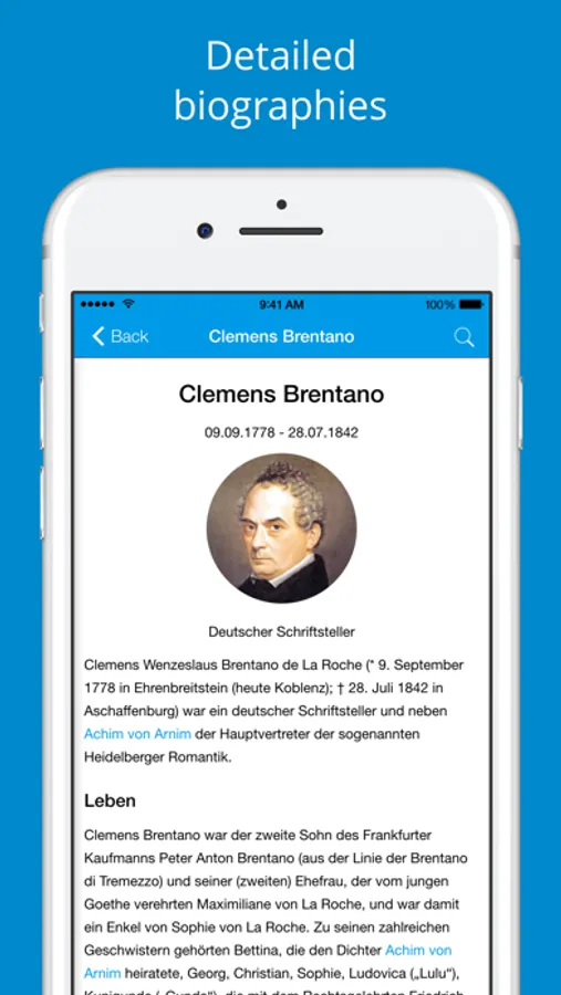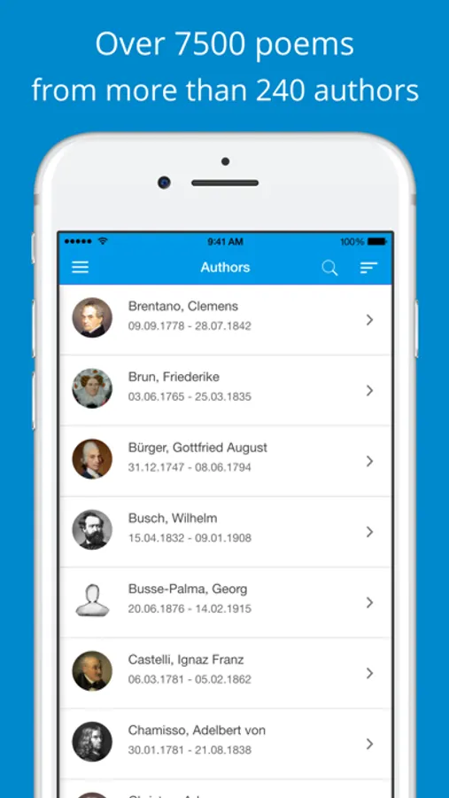 With the German Poetry app you gain access to over 7500 poems by more than 240 different authors.