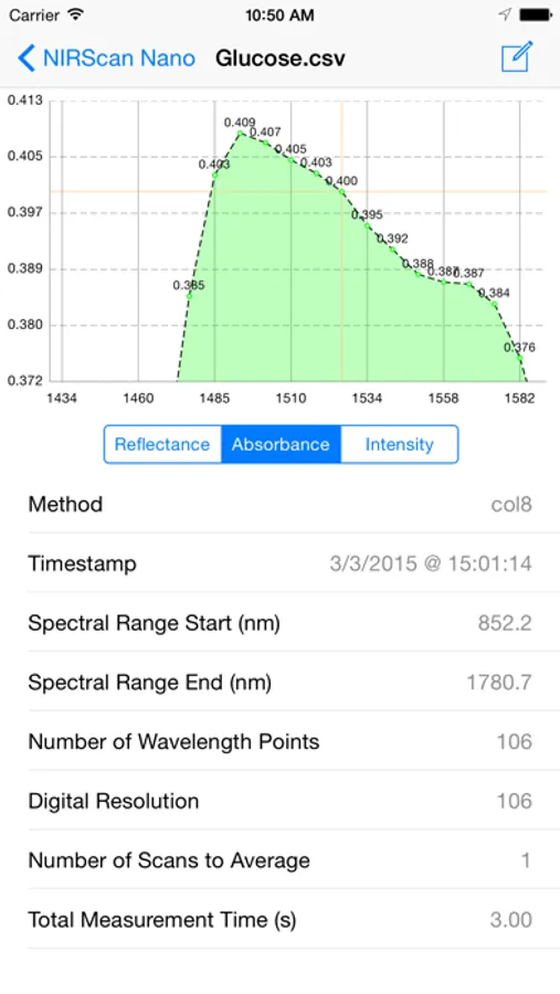 1. Perform Near Infrared (NIR) Spectroscopy scans from 900 - 1700nm and instantly view Reflectance, Absorption, and Intensity data on any iOS Device equipped with BLE.
