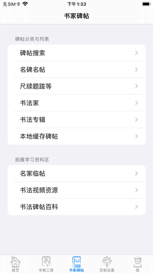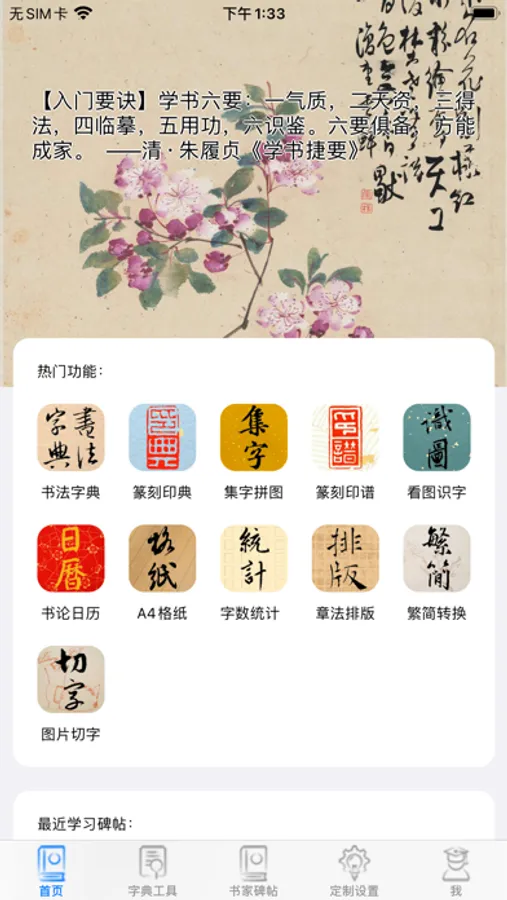 1,首页展示经典国画、经典书论、热门工具、最新学习碑帖入口;