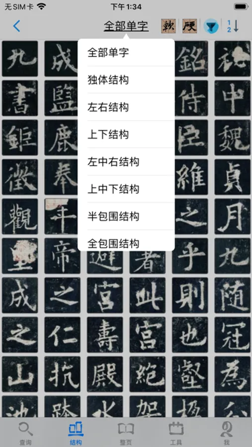 18,工具页提供“书法字典”功能,书法字典可控制朝代、字体范围,查询结果以碑帖为单元,点击进入单字页,罗列该碑帖同一个字的所有写法;