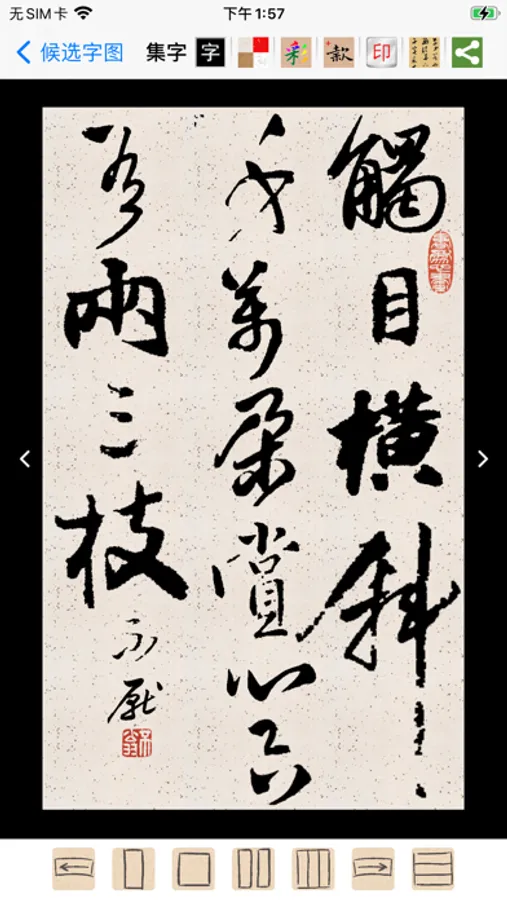 13,“拼一拼(集字)”功能提供三个入口:本地相册图、碑帖内、在线字库自由集字;提供5种经典书法章法选择,并可以对上下款、印章做排版;