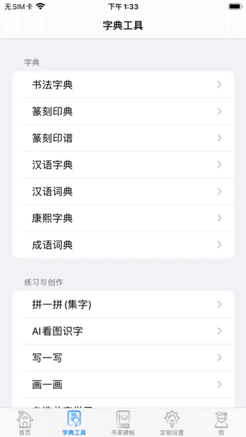 2,字典工具栏目提供众多字典与工具,供大家学习书法时检索资料、模拟章法、基础资料准备等等;