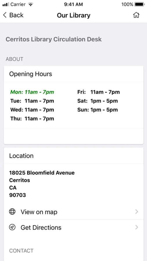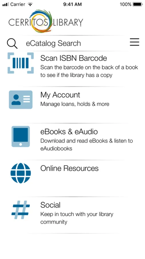 Experience the Cerritos Library from anywhere in the world through the Cerritos Library To Go mobile app. Take a tour of the award-winning library, browse the eCatalog, check the event calendar, connect to the library’s YouTube videos or contact a reference librarian. Scan a book’s ISBN barcode to find out if the book is in the library’s collection. Cerritos Library cardholders can access their accounts and the library’s research databases, download eBooks and eAudio Books and place books on hold.