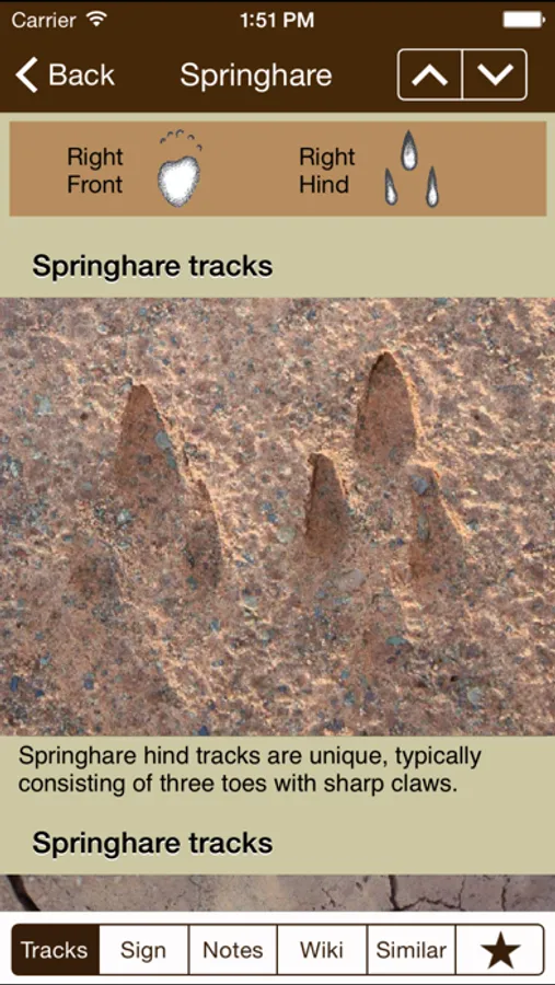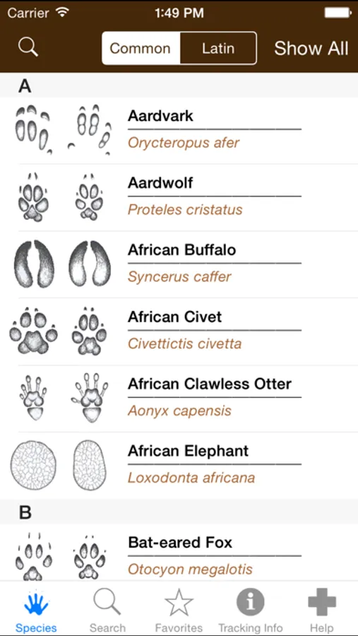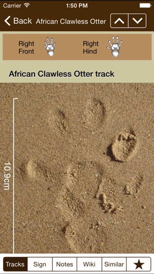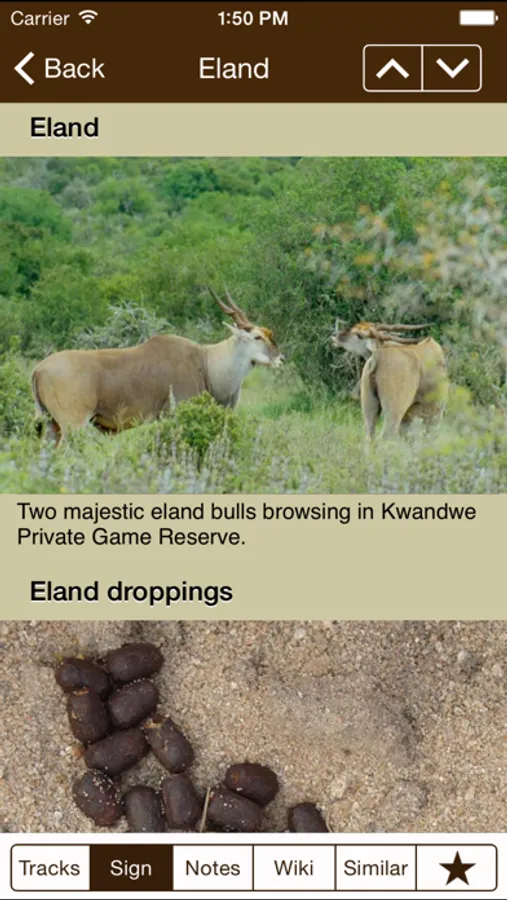 • Track and sign information for 50 Southern African mammal species (this number will continue to be added to in future updates).
