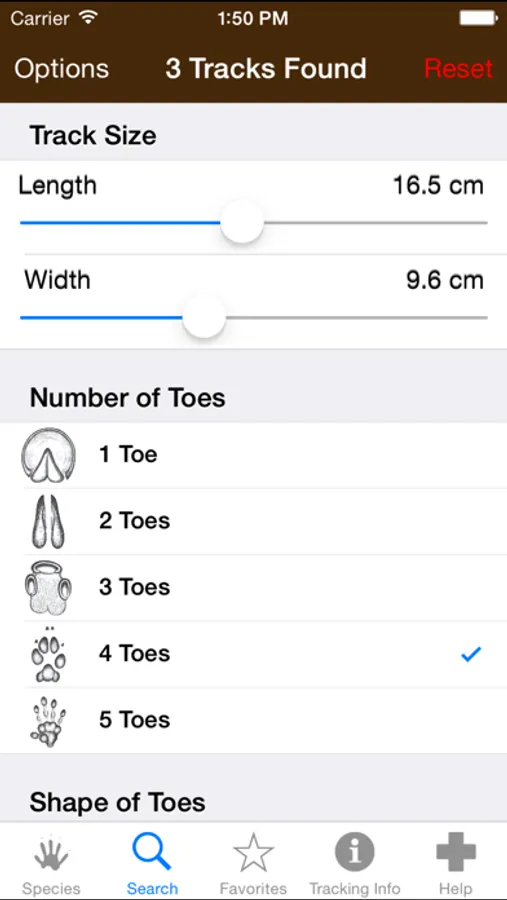 iTrack Southern Africa, goes far beyond what a traditional field guide can offer with a powerful search tool developed by Jonah to simplify track identification in the field. It makes use of basic track features, length and width measurements and your locality to narrow down the options. If you’re not sure what criteria to choose, just leave it out and the tool will still provide you with a list of possibilities based on the information you have given it.