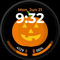 Halloween Pumpkin themed watch face with green and orange theme color options.