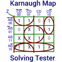 This application tests the user's ability to solve 4 variable Karnaugh Maps (KMaps). The application is Free and does NOT contain any ads or have any in-app purchases. The application presents an unsolved KMap, which the user solves by looping the logic highs (1) and / or the Don't Cares (X). O
