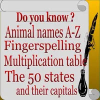 New and fun way to learn and memorize -Animal names and their sounds -ASL(fingerspelling) -Multiplication chart -The US states and their capitals and more choices to be added every time
